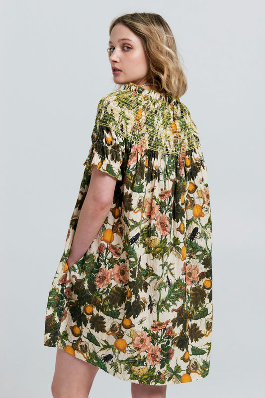 Gaia Smocked Mini Dress Macadamia Multi/Green Smocking