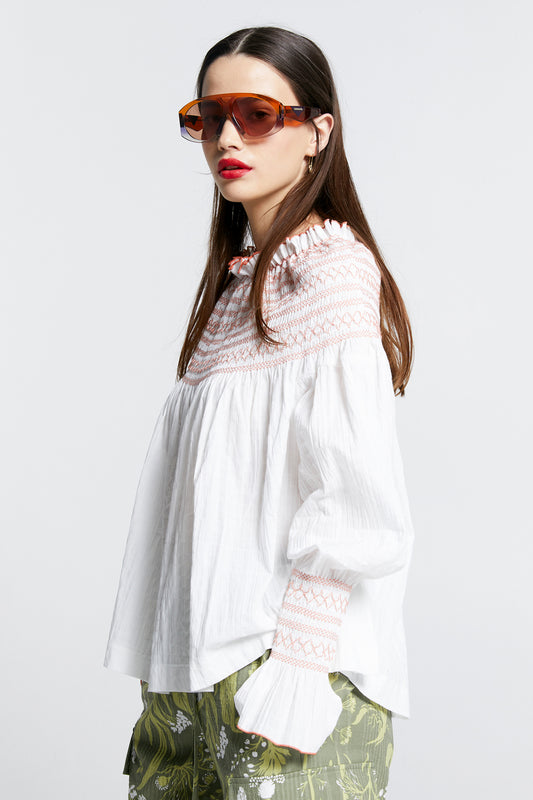 Gaia Long Sleeve Smocked Blouse Off-White/Watermelon Smocking