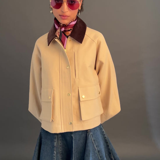 The Chore Jacket nods to workwear heritage, cut in showerproof cotton twill for both practicality and polish. It features a rich brown corduroy collar, a chest pocket, and generous patch pockets, accented with gold button detailing down the front. With a straight silhouette, it’s a transeasonal outer layer designed for everyday wear – functional, durable, and refined in equal measure.