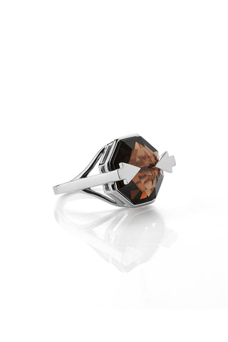 For the Galactic collection, Karen Walker's iconic arrow takes flight, exploring an obsession with space travel and astronomy. Framed by a pair of iconic Karen Walker arrows, an octagonal-cut stone of smoky quartz sits atop a sterling silver band to create the Astrid Ring.