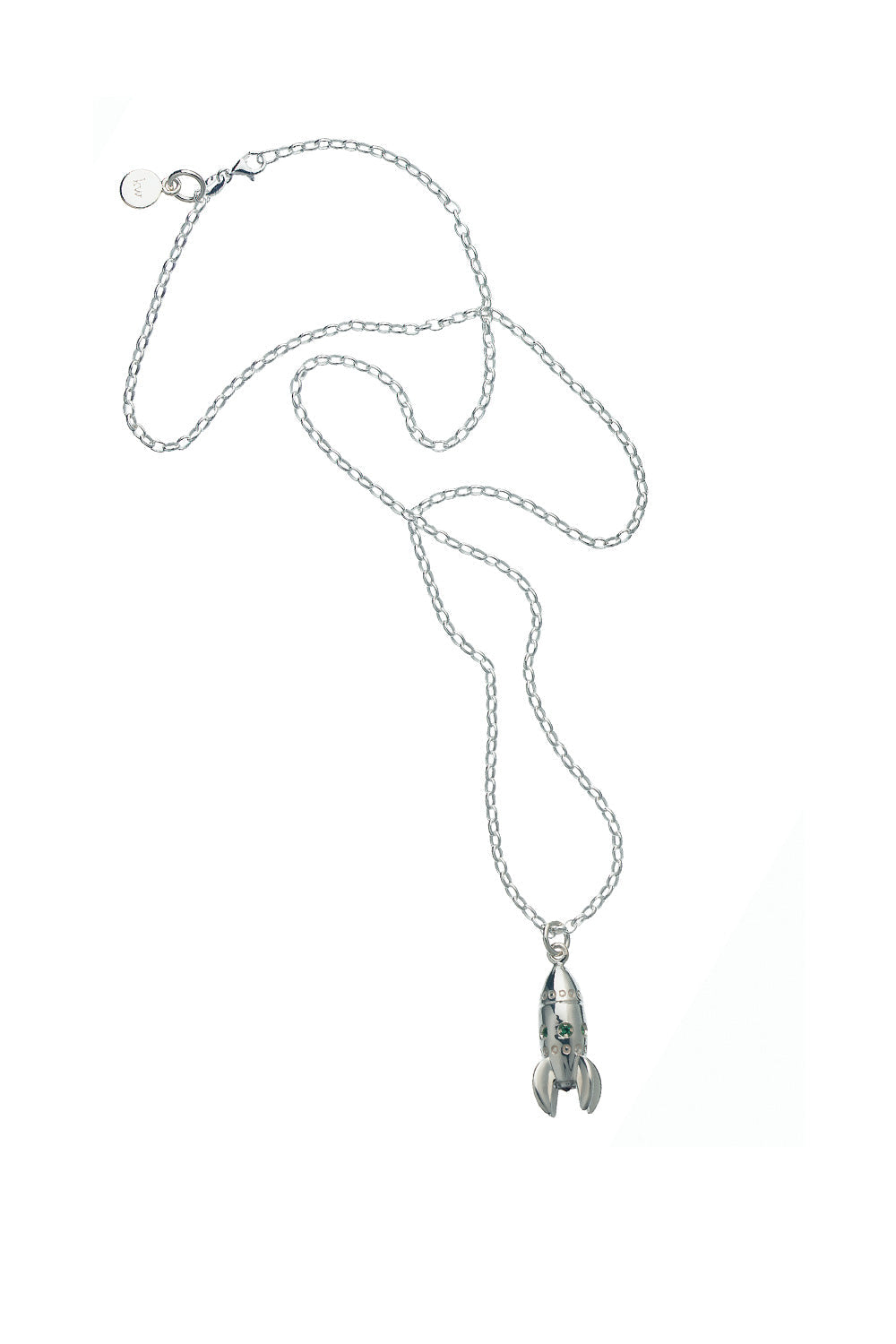 Ready for takeoff, the sterling silver Rocket Necklace features a rocket with elegantly pointed fins and a curved atomic-age body adorned with sparkling biron emeralds and garnet, suspended from a classic belcher chain.