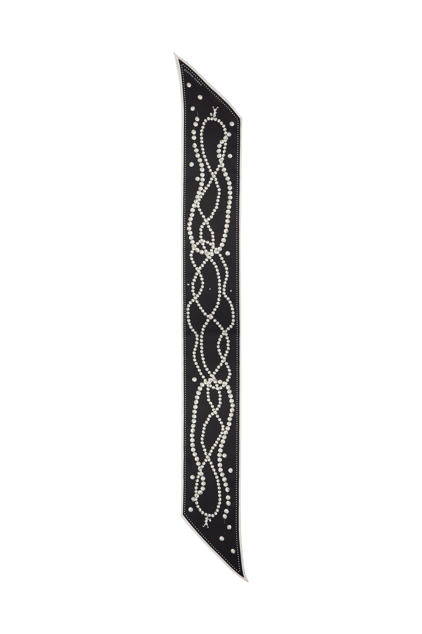 The Runaway Pearls Sash Scarf is cut in 100% silk with the signature print. Its elongated shape offers versatile styling—worn as a headband, at the waist, or draped.